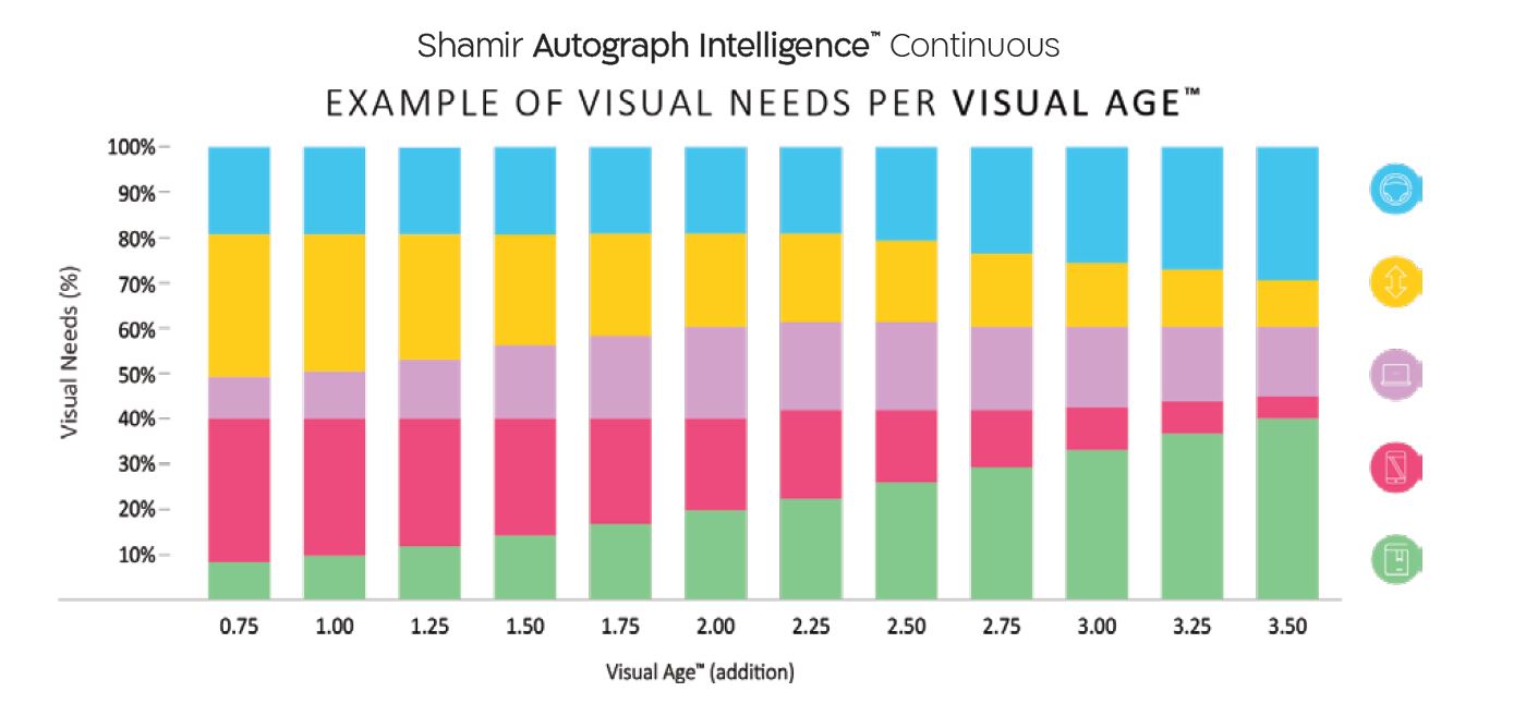 Progressive lenses are kind of rudimentary, if you think about it. They take into account the two different prescriptions and the size of the frame, but that’s all that determines the gradient. Autograph Intelligence overcomes these limitations of traditional progressive lenses with the most precisely personalized lens designs. To do this, Shamir examined the visual behavior and preferences of patients of all ages between 40 and 80, by taking into account their Visual Age (the physiological age of the eye).